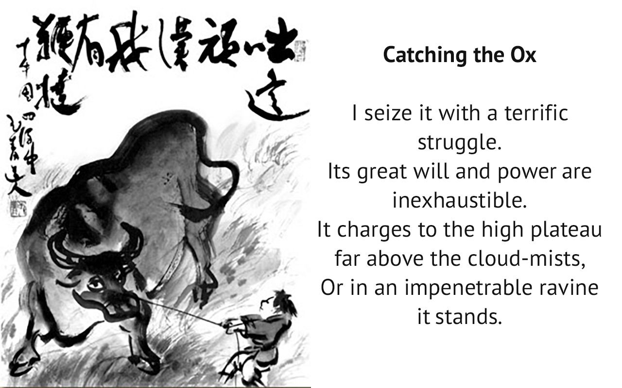 This month our yogi finally catches the ox. Remember the ox represents our true nature, the genuine essence of who we are and the inherent capacity of our human minds to awaken. When the yogi catches the ox, it's like seeing the truth of what's possible and fully feeling it in the body. We've all had these kinds of moments. For instance, when we seemed completely still and present during meditation, when not overreacting to a situation seemed natural, when walking down the street and noticing that everything seemed bright and alive and/or having a moment of penetrating clarity about the truth of your habit patterns without the accompanying shame. These moments of embodied presence are so impactful that we mistakenly believe we own the awakening process, or we think we know what it is. But there's a catch; one need only look at the picture and verse to see it...