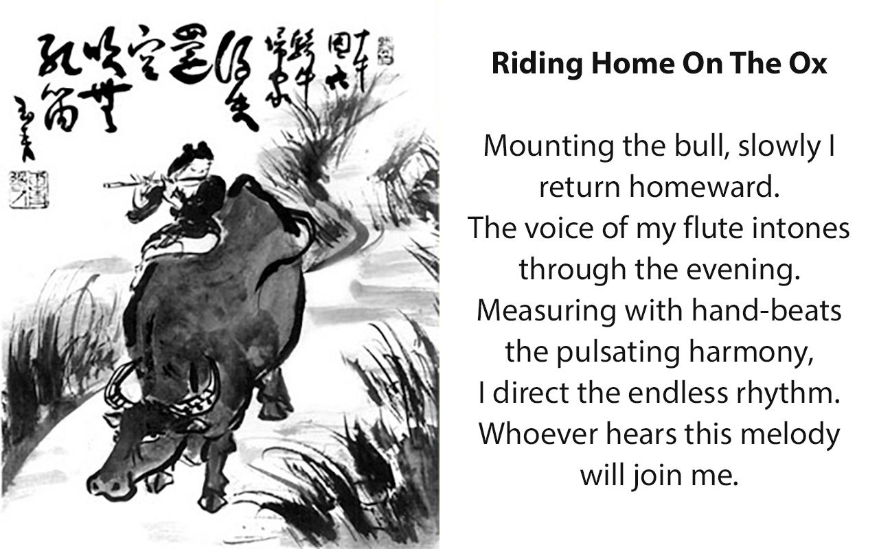 Let's turn towards the picture for a moment. You'll notice that the yogi is a reasonable size in this picture, not tiny like last month's. They're casually riding the ox with their leg up and playing the flute. They are riding the ox on its back where there is the least amount of control. In some pictures, you will see the yogi is not even looking forward, they're looking backwards. You can see the path is readily identifiable and the ox is actually watching the yogi instead of the yogi watching the ox. The verse begins with pointing out that this is a slow process. We come into embodiment slowly. It's not something that can be forced. I think the relaxed posture and playing the flute refers to the happiness of being in the present moment. What most people don't realize is that when we learn to be in the present moment, there is a natural happiness that arises with it. Phillip Moffitt calls this happiness well-being that includes non-well-being. In other words, it's a happiness that knows both pleasant and unpleasant sensations, but is not defined by either. I think the pulsating harmony refers to the connection to the breath, or our aliveness in any given moment and the knowing of Dhamma. Finally, the last lines point to the connection we have with sangha around this practice.